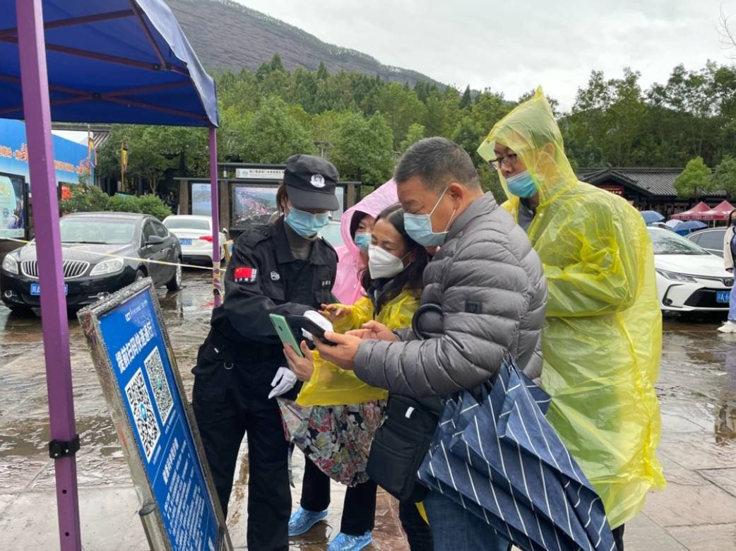 提示扫码、检测体温……当日,记者在剑门关景区看到,不管是在购票窗口,还是景区入口,带着口罩、身穿雨衣的游客络绎不绝,景区人员接待工作井然有序。