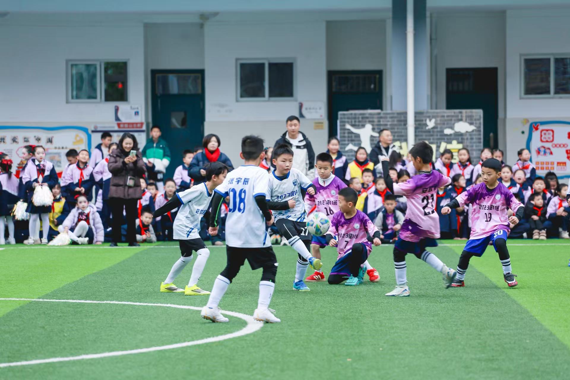 “从组队选队长、想口号,到一起筹备比赛、上场踢球,这学期太有意思啦!”何艾俊蹦蹦跳跳地分享,眼睛亮闪闪的,“我学会了写比赛通讯稿,还能算球队赢了几场、胜率多少,英语也能说好多足球词语呢!和队友们一起商量战术的时候,我知道要听别人的想法,现在上课发言、上台分享,我都敢大声说话啦!”