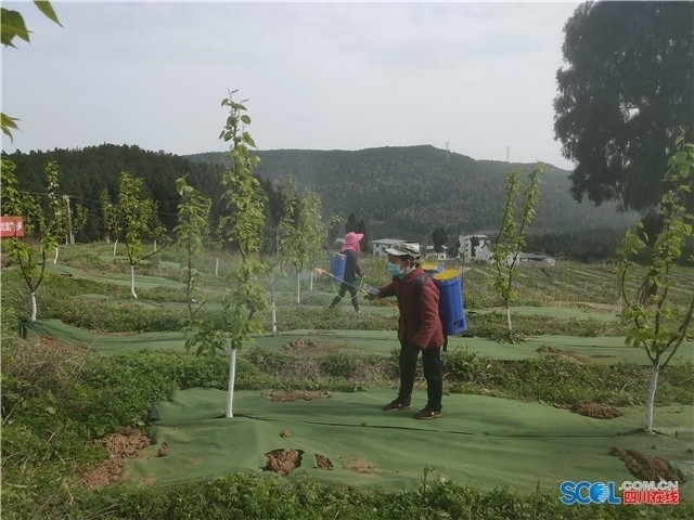 (龙潭乡金鼓村秦巴金梨产业园正在进行保花保果)