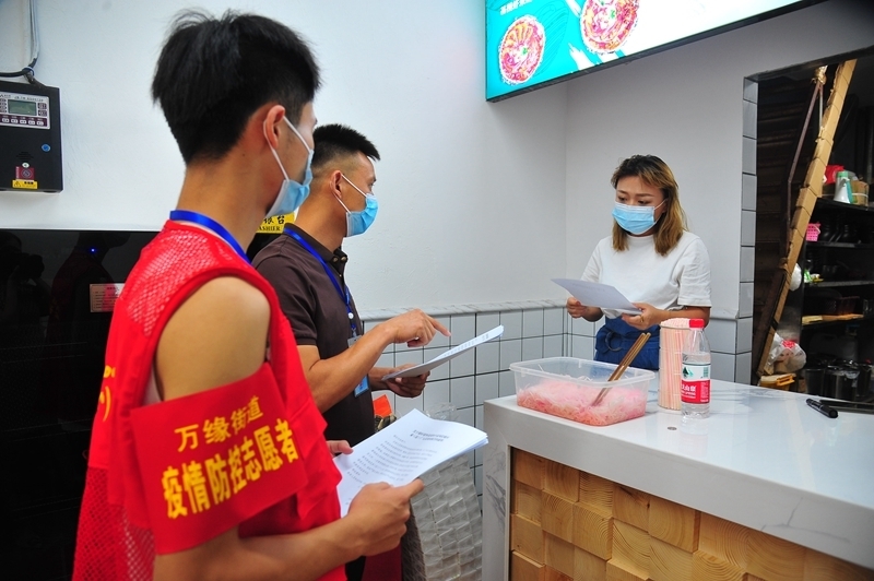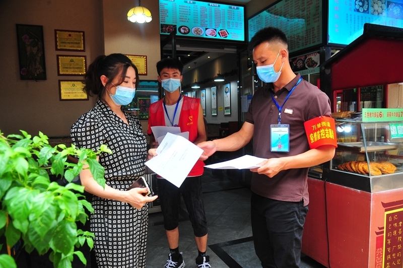 “请积极配合社区工作,如有外来人员及时向我们报告。”万缘街道古堰社区党委书记马金山,正带领社区志愿者在万达金街向商铺业主宣传防疫知识、发放宣传资料。