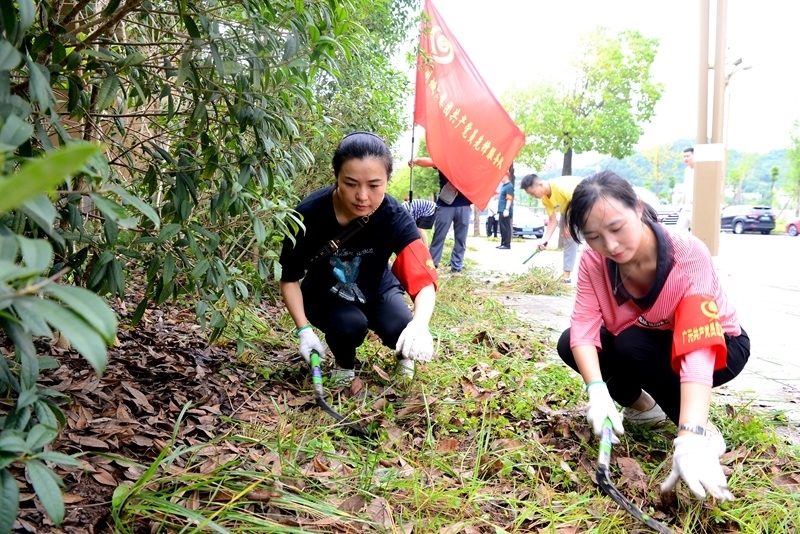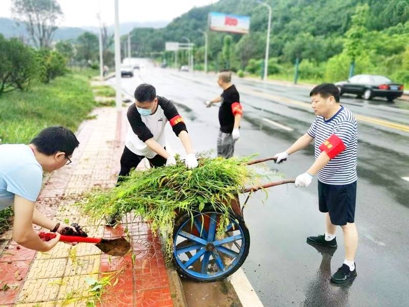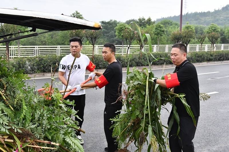 8点30分,大石镇青岩村漫水桥两侧绿化带里,“党旗、党徽、红袖章、小红帽”,这些标志党员志愿者身份的红色,在绿色映衬下,格外醒目。大家挥舞着镰刀娴熟的将杂草割下,顾不上拭去额头的汗水,又忙着将杂草装车运走……