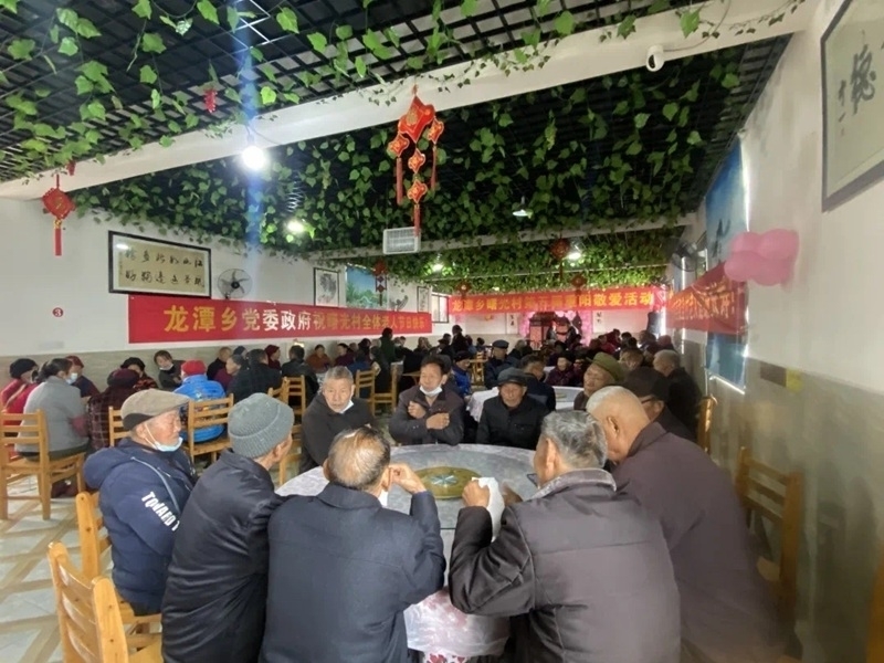活动现场洋溢着欢乐喜庆的气氛,曙光村村组干部和党员志愿者们忙前忙后,老人纷纷围桌而坐,共享佳肴,大家喜笑颜开,举杯同乐,现场其乐融融。
