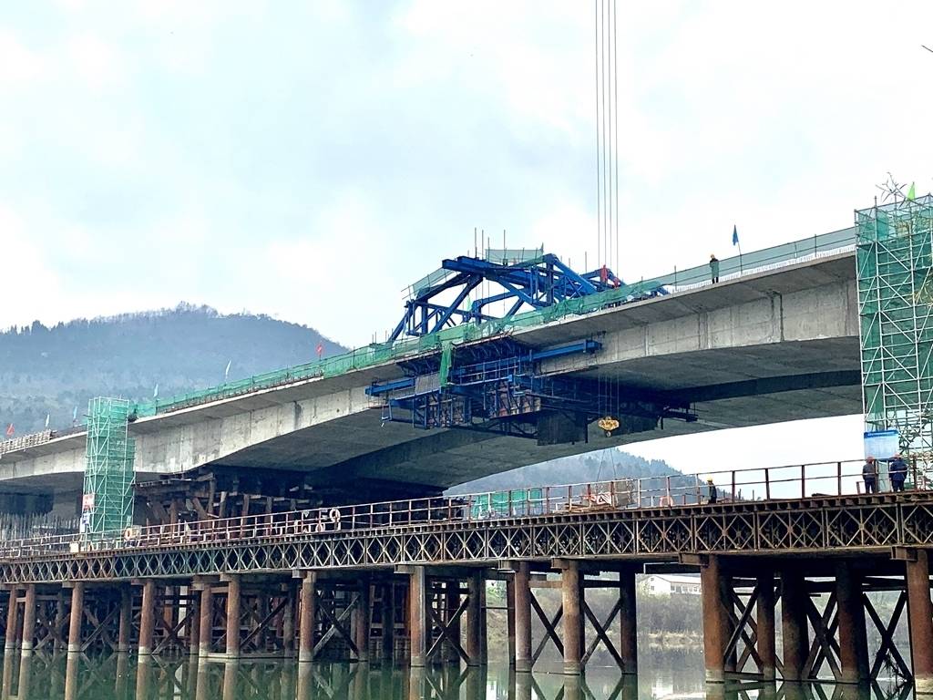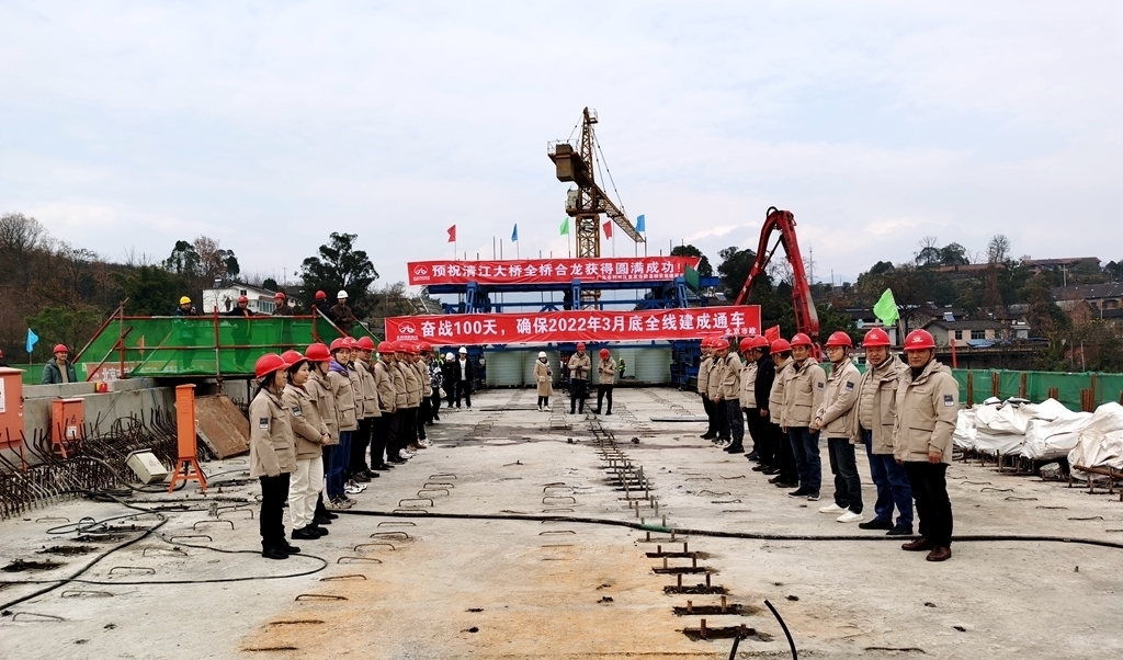 陵宝快速延伸路宝轮段工程清江河大桥是广元市利州区陵宝快速延伸路宝轮段项目的控制性工程,该桥横跨清江河宝轮段,连接安全坝及刘家河两大核心片区,建成后将成为三江新区标志性建筑之一。该桥合龙之后,下一步将进行桥面铺装、防护栏、照明等附属设施施工,预计2022年3月底全线建成通车。