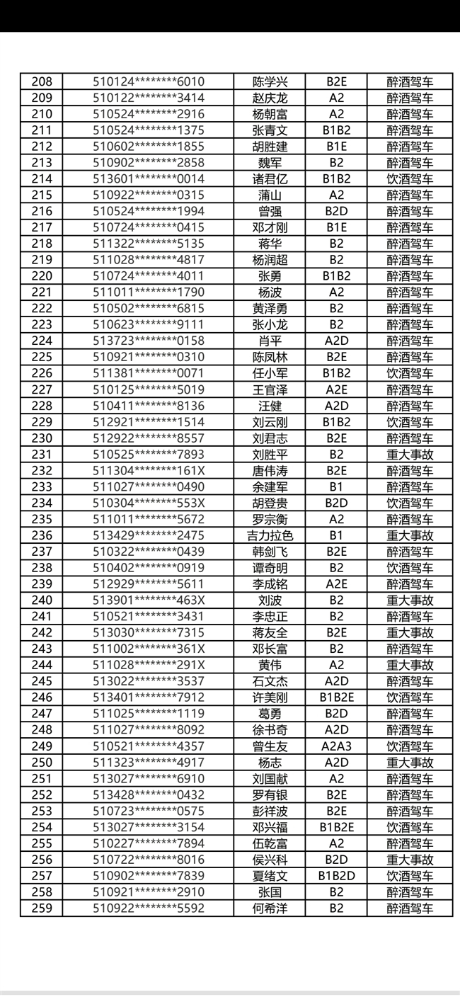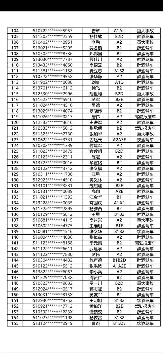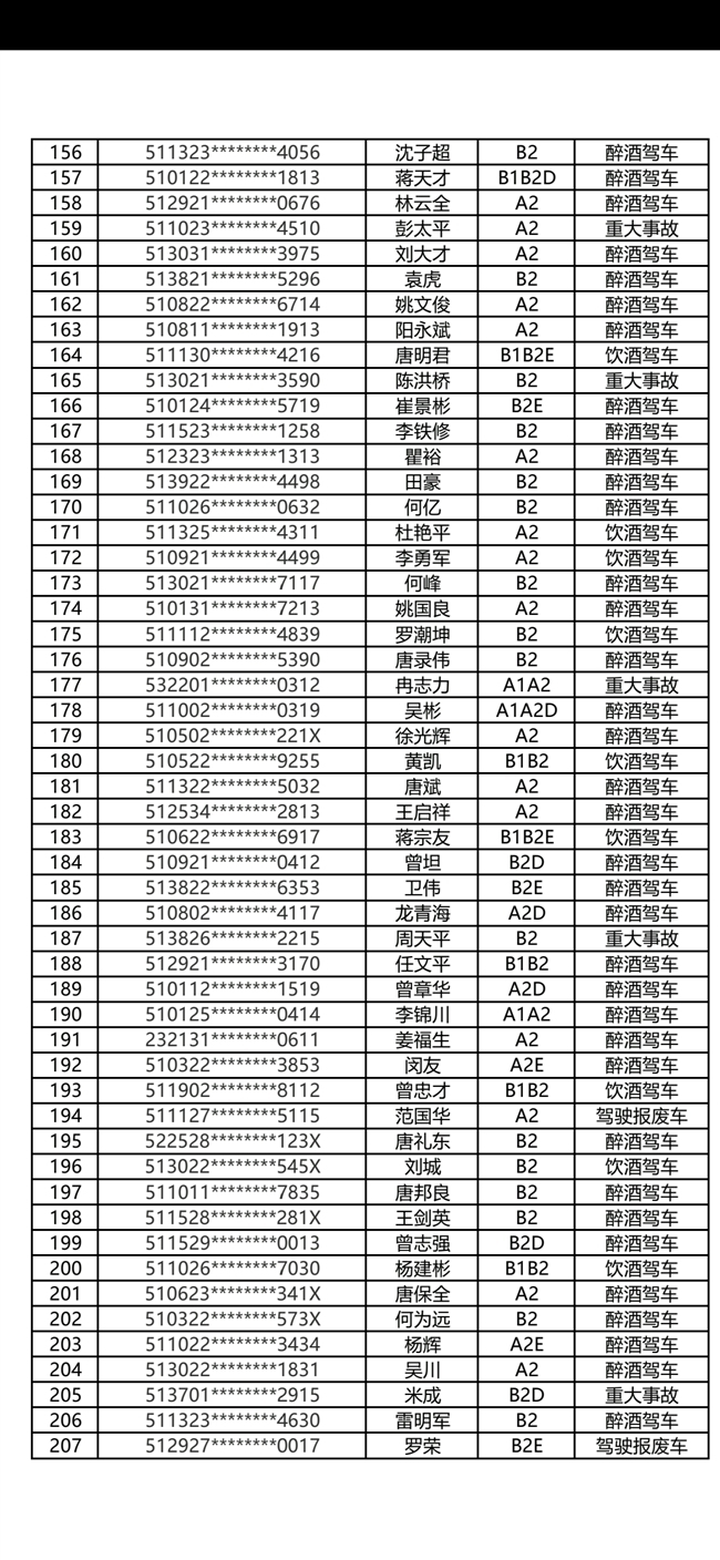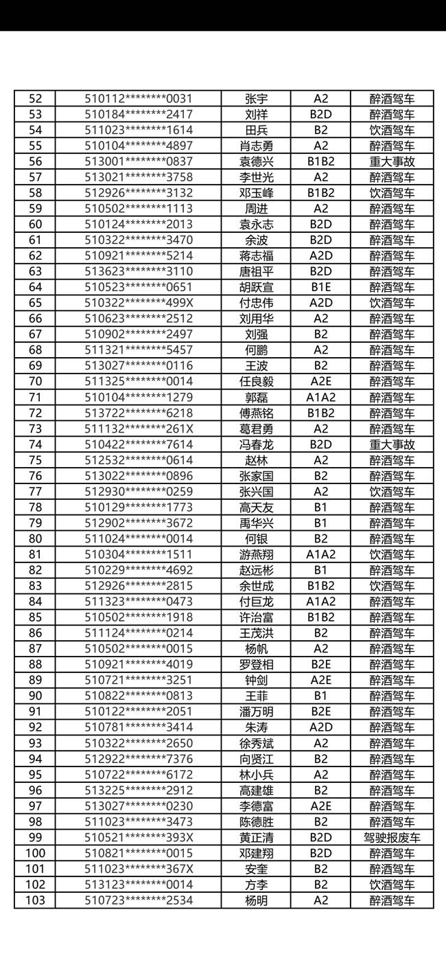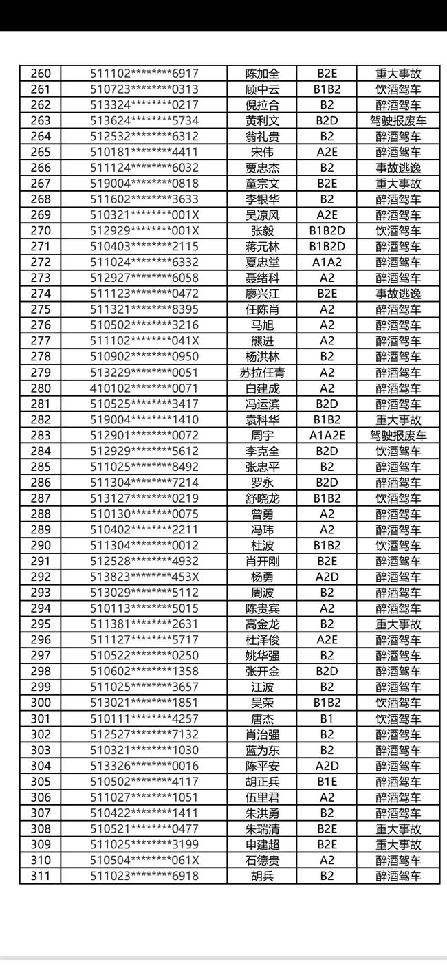 为规范营运车辆运行、服务社会经济发展、提升群众出行安全感,按照《四川省道路交通重点驾驶人“黑名单”管理暂行办法》规定,四川省公安厅交通警察总队联合四川省交通运输厅运输管理局依法对2021年一季度以来机动车驾驶证、交通运输从业资格证“双吊销”人员进行了梳理,共计筛查出356名营运车辆驾驶人,按照要求纳入“黑名单”管理,现予以公布。