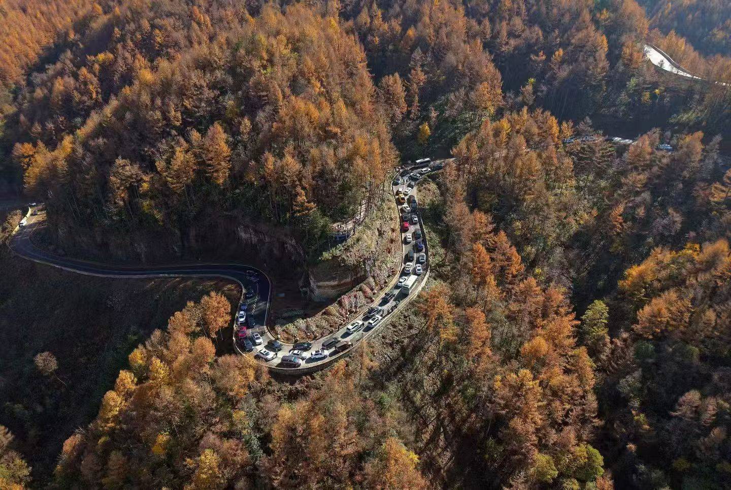清晨的鼓城山——七里峡景区,薄雾尚未散尽,山脚的停车场已停满各地牌照车辆。“我们早上7点就出发了,没想到还是排起了长队!”成都游客王丽一边给孩子整理帽子,一边笑着说。虽然进入景区车辆堵车,但沿途窗外的红叶已经让她忍不住频频拍照。