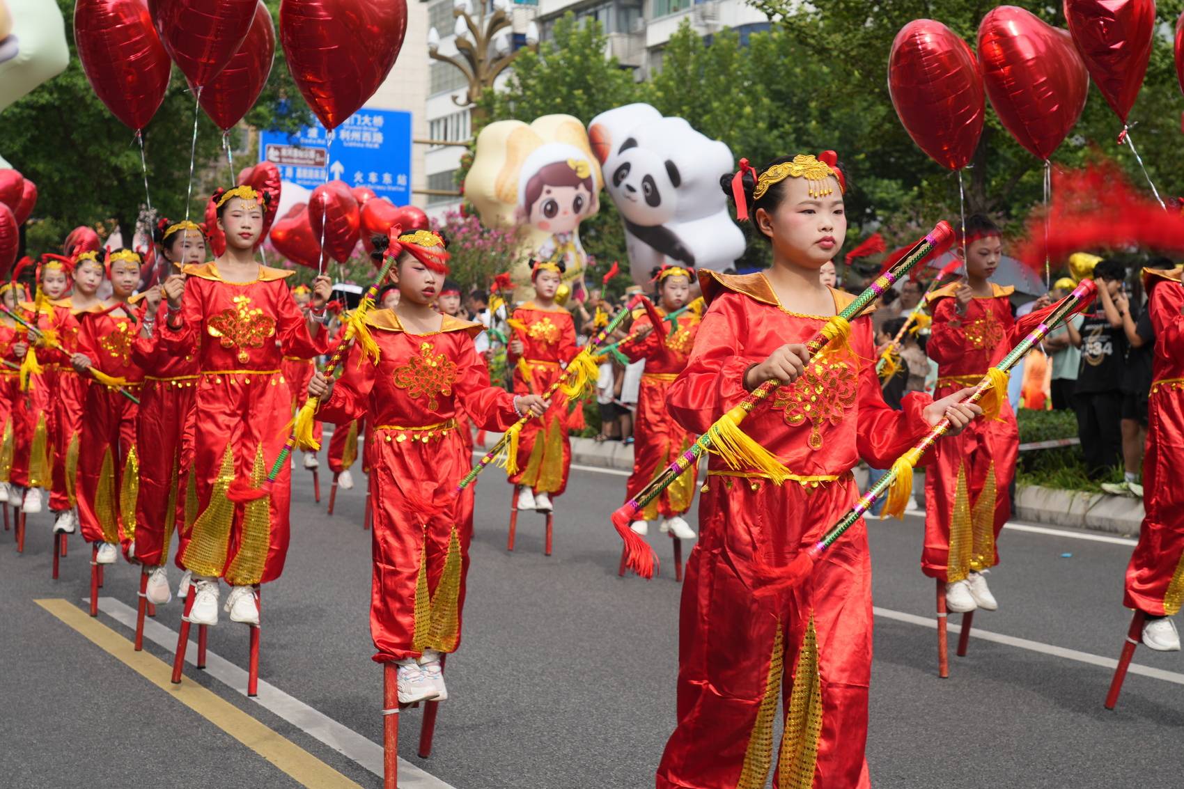 “曌动广元”非遗民俗主题群众巡游活动上,广元儿童展示非遗代表性项目——踩高跷。广元观察 袁茹莉 摄