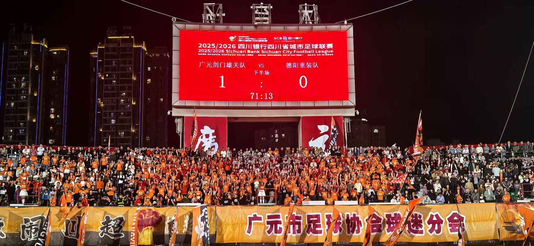 四川在线消息(乐虹辰 高志农 袁茹莉)10月18日晚,2025/2026川超联赛川北赛区第五轮焦点战在广元主场落幕,广元剑门雄关队1:0击败德阳重装队。赛场之上竞技激烈,赛场之中光影传情。上半场结束后,600余架无人机以体育场夜空为幕布,上演两地跨城“空中对话”,让“体育搭台、文旅唱戏”理念鲜活落地。