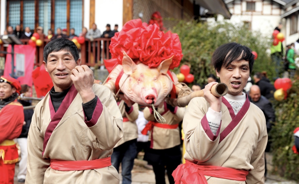 最受欢迎的莫过于“年猪巡游”。活动期间,村民身着盛装,抬着刚宰杀的年猪沿街巡游,展示丰收成果,引得不少游客跟随喜庆的锣鼓声加入巡游队伍。“现场特别热闹,一下子就有了过年的感觉。”游客贾晓芳感慨地说。