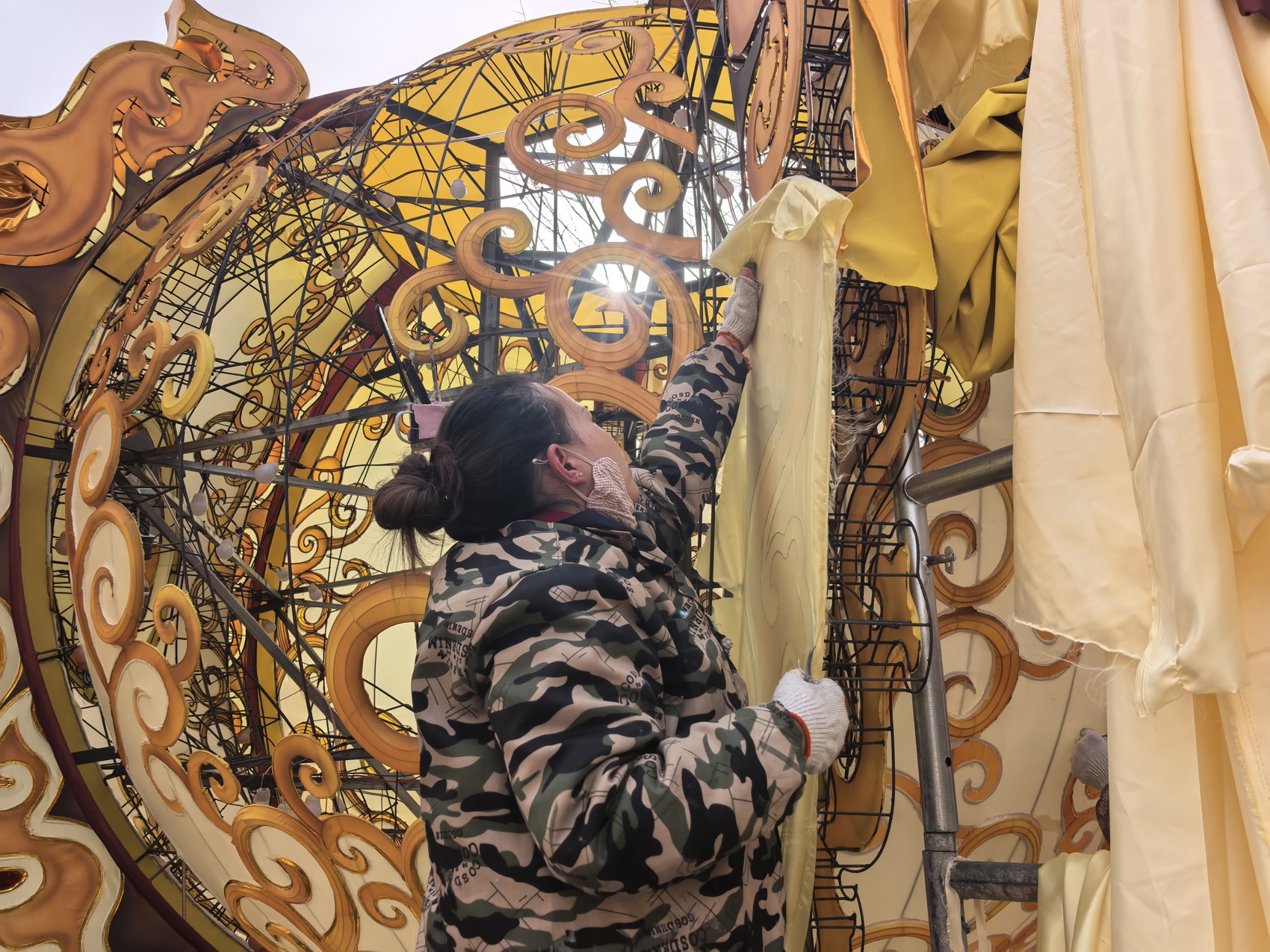 放样、折弯、焊接,铺灯、裱糊、上色,再到安装调试——一道道工序在工匠们灵巧的手中流转、衔接。彩灯工匠游成莉说:“要做得出彩、好看,把‘年味’做进灯里。”