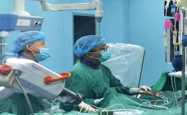 术中,患者在全身麻醉下,神经外科副主任医师郭锦经由患者右侧股动脉建立了一个微小的穿刺通道,在高清数字减影血管造影(DSA)的实时路径图引导下,操作微导丝和支架微导管犹如驾驶“微创飞船”,精准地穿越迂曲的颅内血管,将密网支架输送至预定位置——右侧大脑中动脉M2段远端。