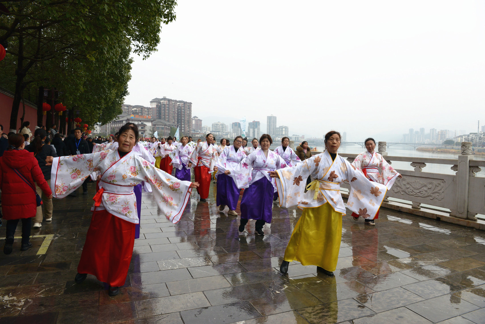 四川在线消息(乐虹辰 冯小珈)2月20日,在广元市利州区嘉陵江两岸(皇泽寺到凤翔楼沿途),百名身着唐风汉服领舞人员和前来游玩的群众共同欢乐踏歌,以一曲《女儿河》为“正月二十三·女儿游河湾”群众文化惠民活动增添了一抹绚丽的传统文化色彩。